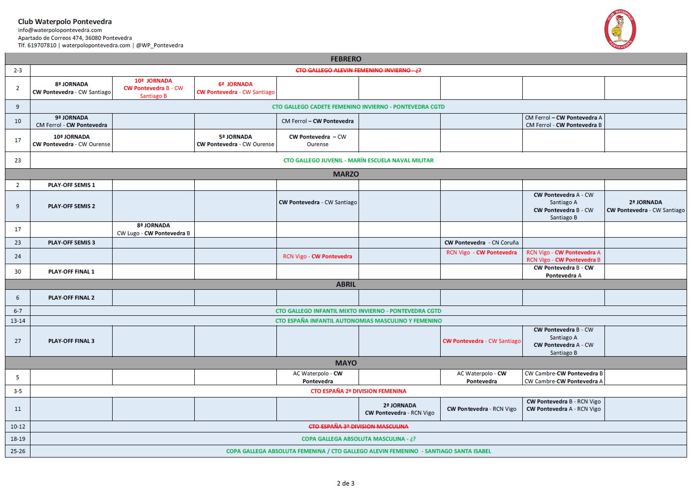 A continuación el calendario de partidos oficiales del CW Pontevedra 2018-19 con las modificaciones en rojo, con respecto al calendario inicial.