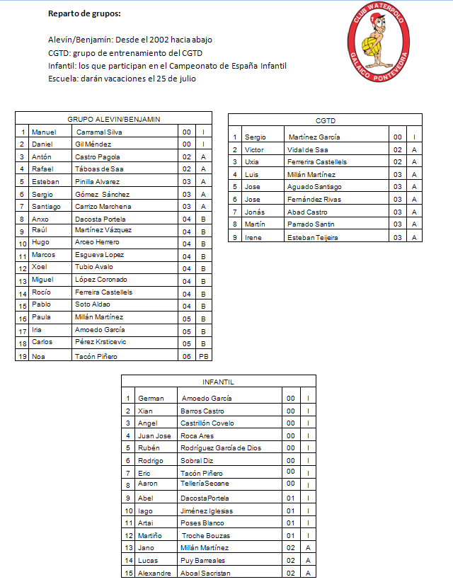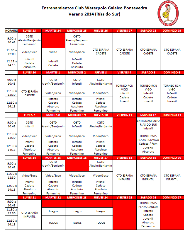 Estos serán los horarios de entrenamiento del CW Galaico Pontevedra a partir del próximo lunes 23 de junio. Todos los grupos entrenarán en Rías do Sur: