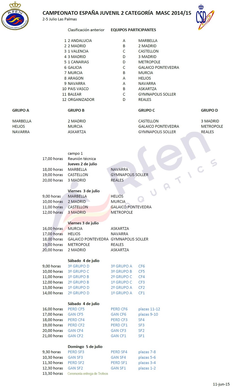 La RFEN ya publicó el calendario del Campeonato de España Juvenil de 2ª Categoría de Waterpolo que se disputa en Las Palmas del 2 al 5 de julio de 2015.