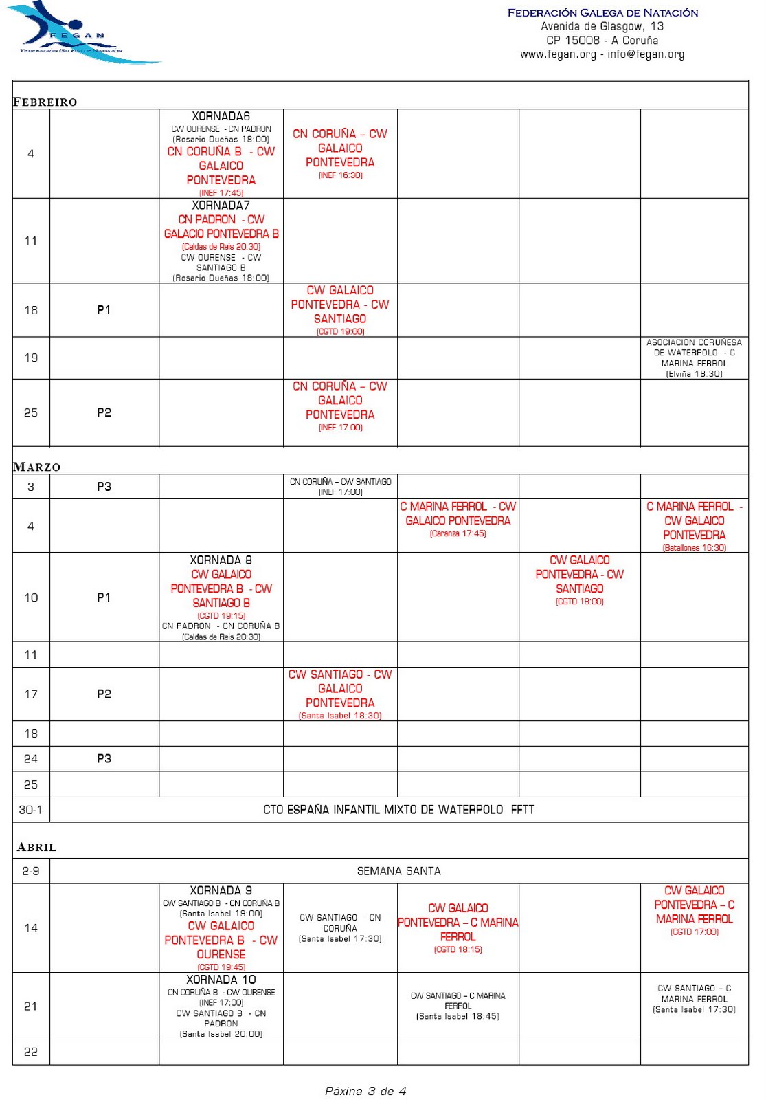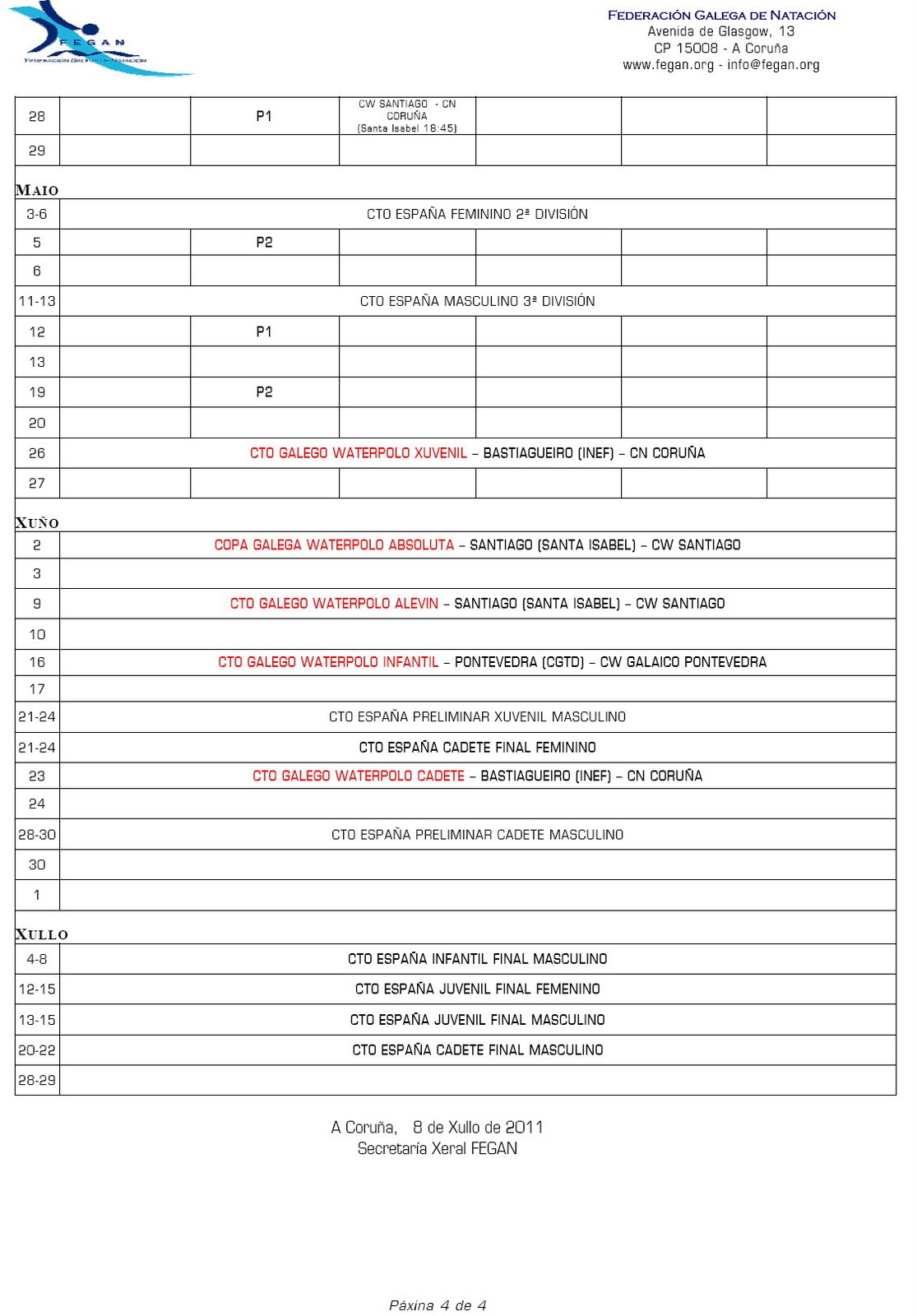 Ya nos enviaron el calendario de partidos de esta temporada 2011-12 de la FEGAN. En rojo podéis ver los compromisos oficiales del Club Waterpolo Galaico Pontevedra.