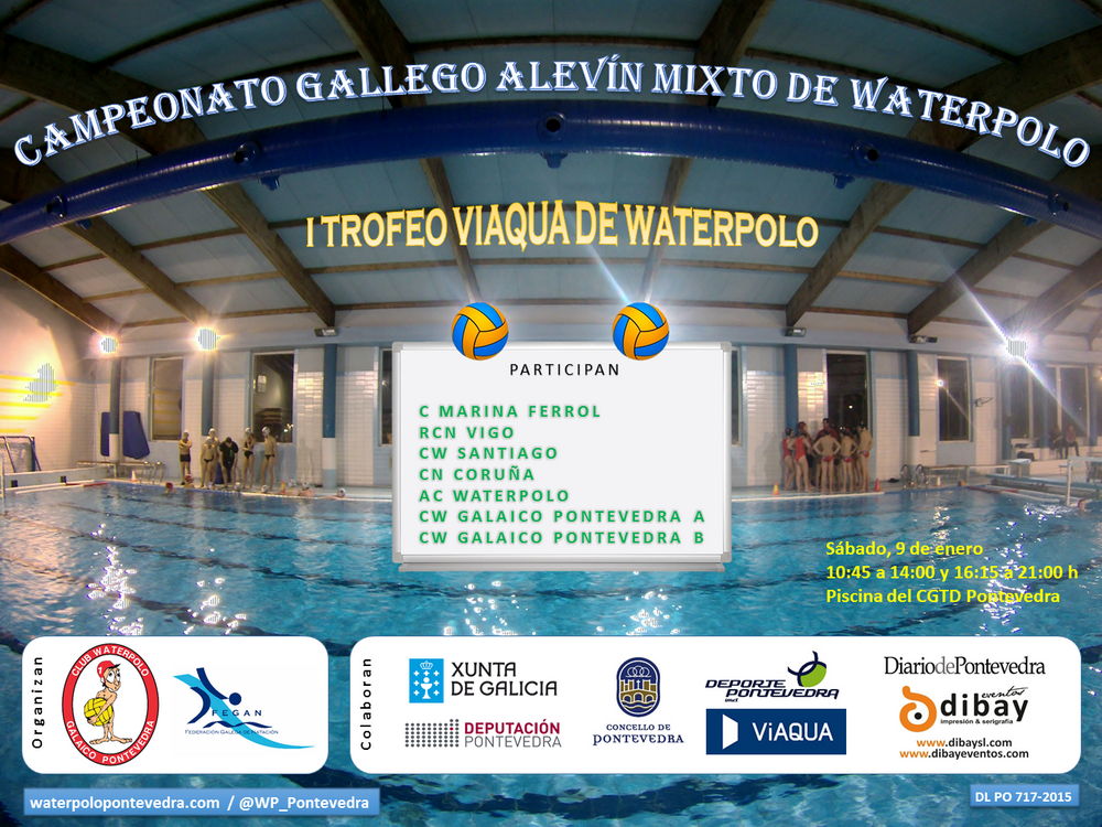 El Campeonato Gallego Alevín de Invierno de Waterpolo y I Trofeo Viaqua de Waterpolo contará con la participación de 7 equipos gallegos: Marina Ferrol, RCN Vigo, CW Santiago, Asociación Coruñesa de Waterpolo, CN Coruña y dos equipos del CW Galaico Pontevedra.