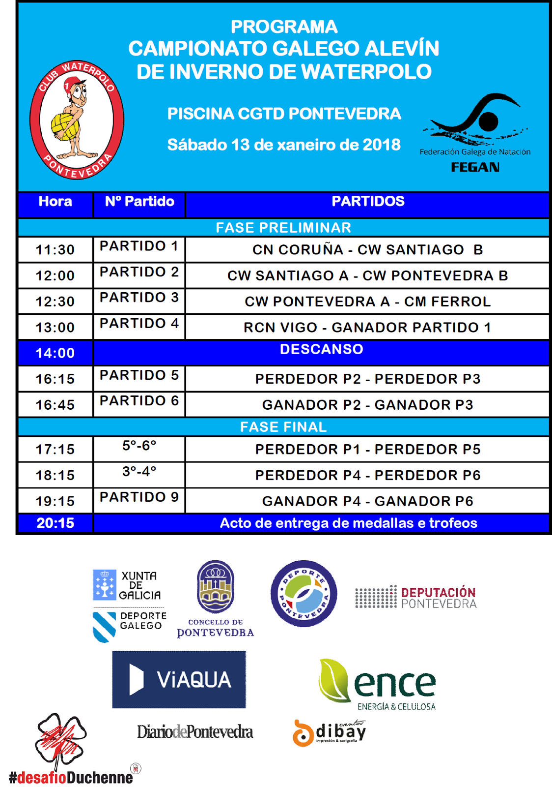 El Club Waterpolo Pontevedra organiza, junto a la FEGAN, los Campeonatos Gallegos de waterpolo de Invierno Alevín y Benjamín en la piscina del CGTD de Pontevedra. Serán los dos primeros de los siete campeonatos gallegos asignados al club pontevedrés como organizador para esta temporada.