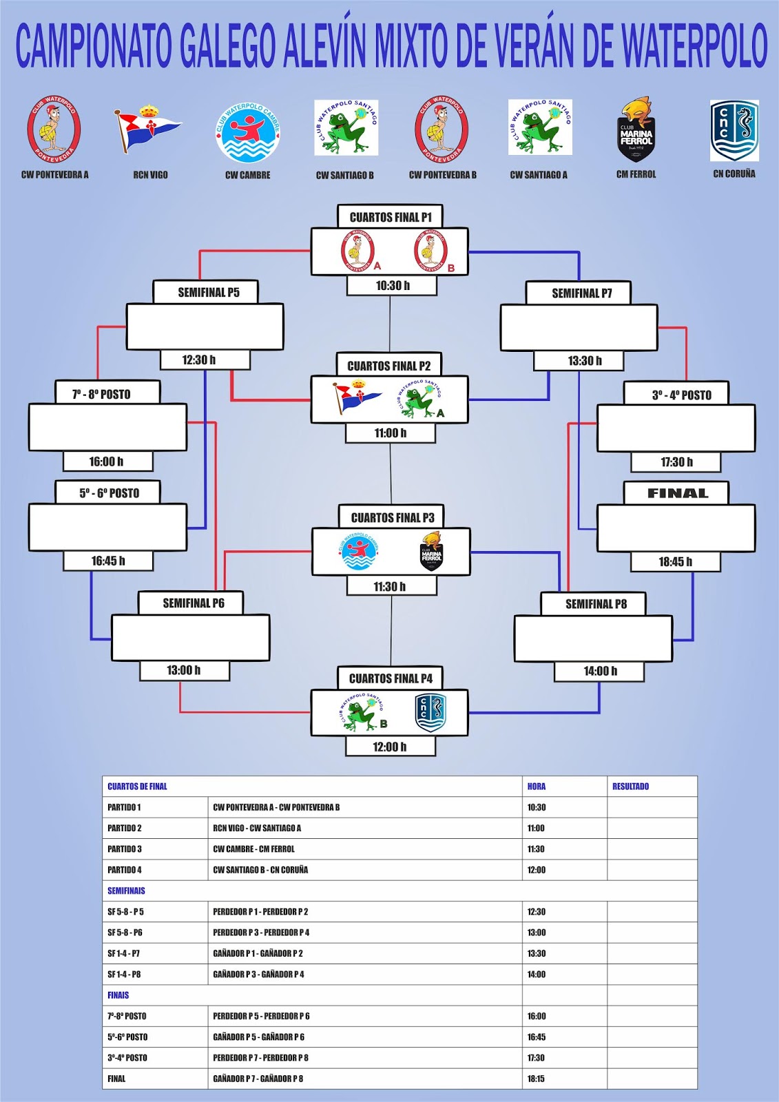 De aquí saldrán las semifinales, por un lado para los puestos 1 a 4 (los que ganen) y por otro del 5 al 8 (los que pierdan), jugando de forma continuada (con una pausa de 14:30 a 16:00 h) hasta las 18:15 h, cuando comenzará la final.