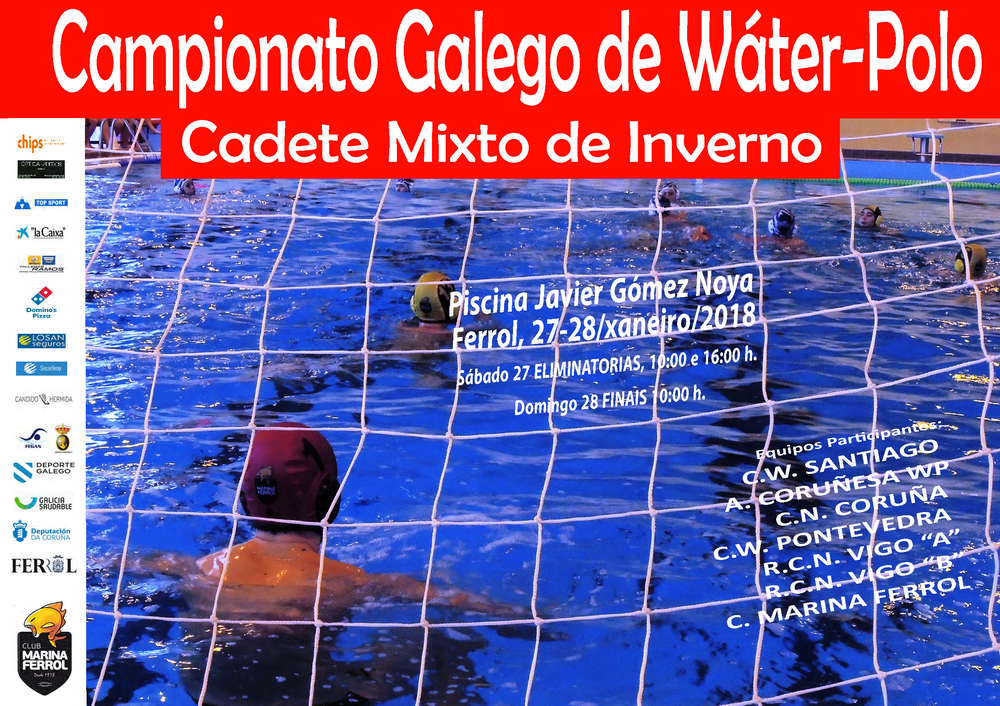 El próximo fin de semana del 27 y 28 de enero el Club Waterpolo Pontevedra se desplaza a Ferrol (CD Gómez Noya) para participar en el Campeonato Gallego Cadete de Invierno de Waterpolo, que organiza el Club Marina Ferrol.