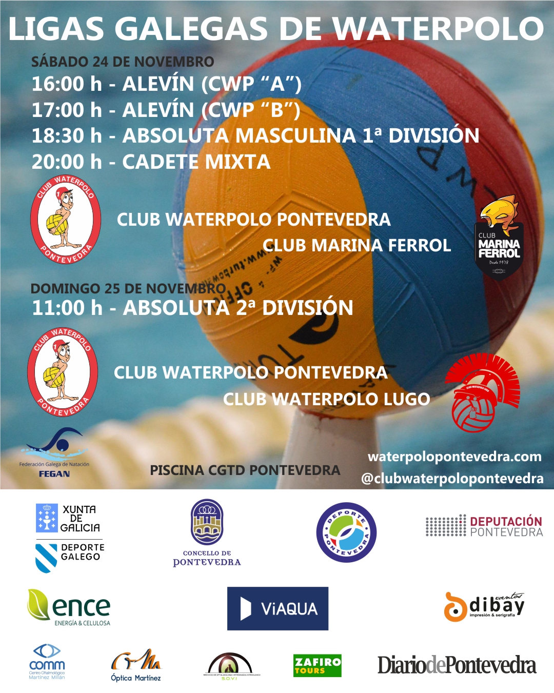 Los dos primeros partidos serán de la Liga Gallega Alevín de Waterpolo, jugando primero el equipo A del CW Pontevedra (16:00 h) y a continuación el equipo B (17:00 h), ambos frente al Marina Ferrol.