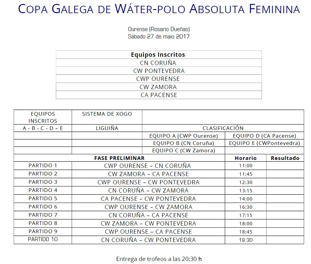 El próximo sábado 27 de mayo se celebra en la piscina de Rosario Dueñas de Ourense la Copa Gallega Absoluta Femenina de Waterpolo, que será “Open”, con participación de dos clubes de fuera de Galicia.