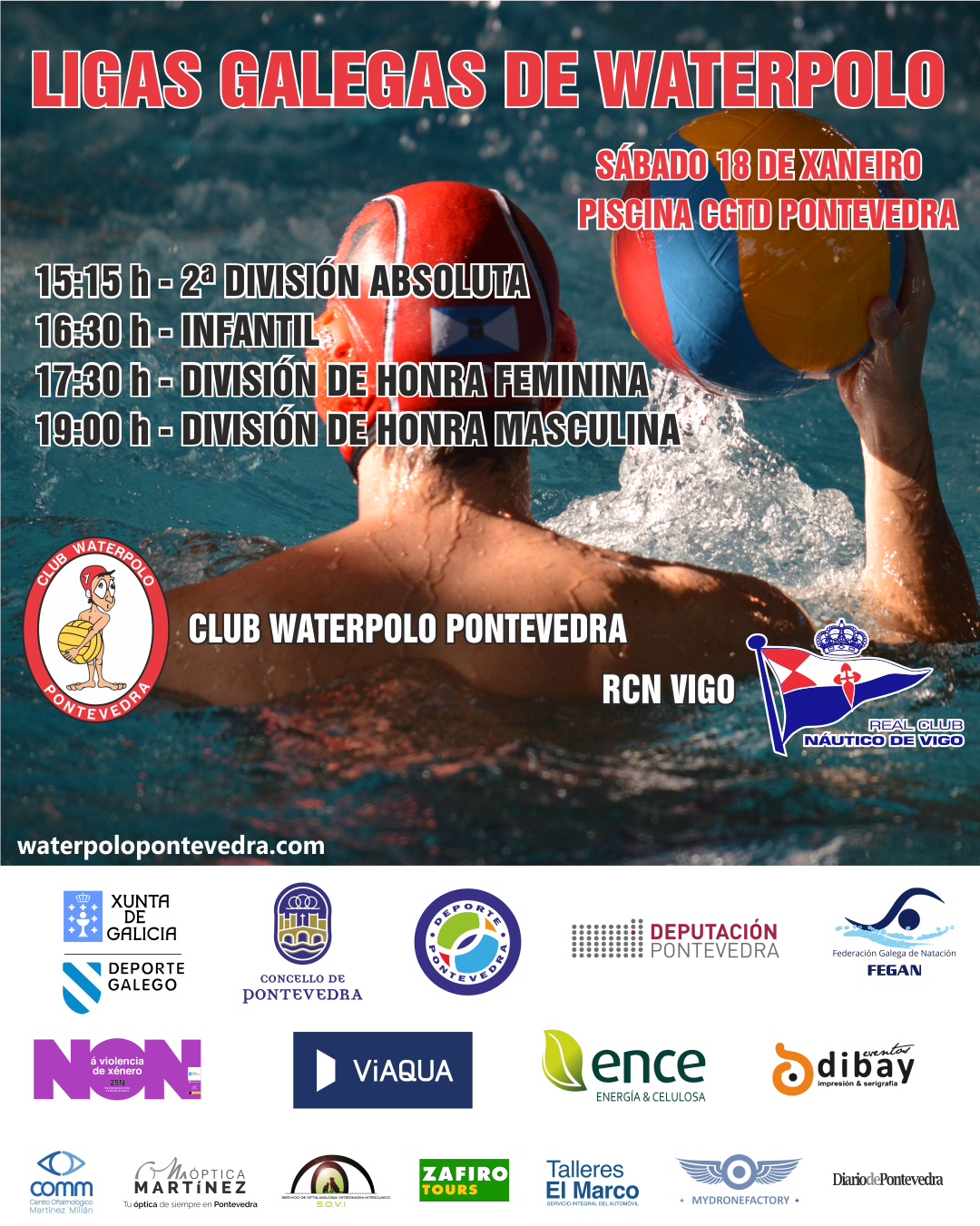 El próximo sábado 18 de enero el CW Pontevedra recibirá en la piscina del CGTD de Pontevedra al RCN Vigo para disputar 4 partidos de las Ligas Gallegas de Waterpolo.