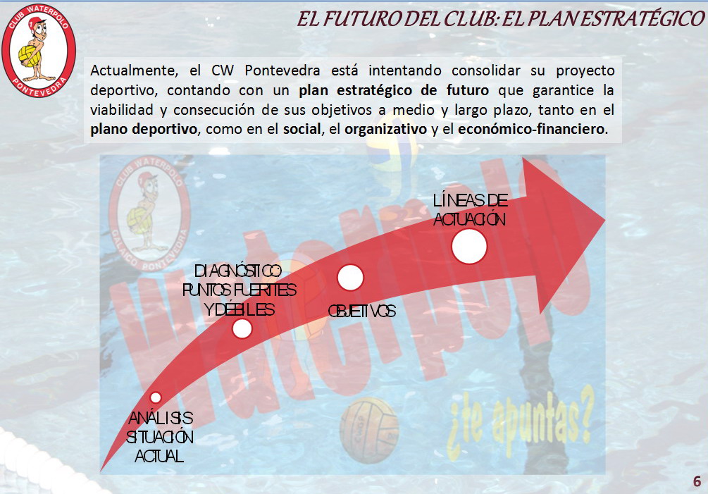 Con todo esto, el Club Waterpolo Pontevedra elaboró su Plan Estratégico, presentando un análisis de la situación, diagnóstico de puntos débiles y fuertes, objetivos y líneas de actuación. Con un análisis del club en 4 áreas: deportiva, social, organizativa y económico-financiera, viendo la buena progresión de la primera, un objetivo es que las otras tres crezcan de forma paralela para “no morir de éxito”.