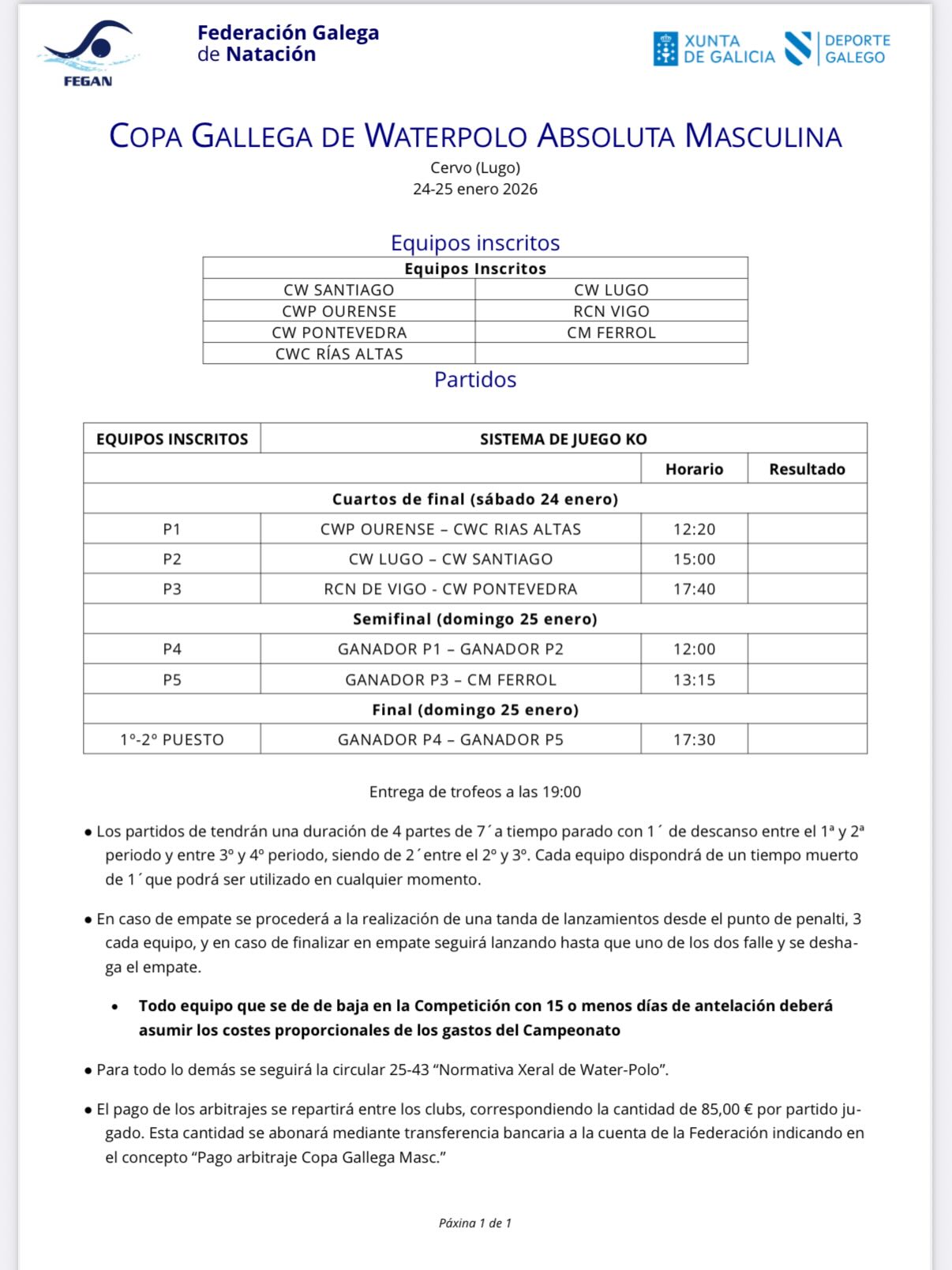 El CW Pontevedra participará el próximo fin de semana del 24 y 25 de enero en la Copa Gallega Absoluta Masculina de Waterpolo, que se celebra en Cervo.