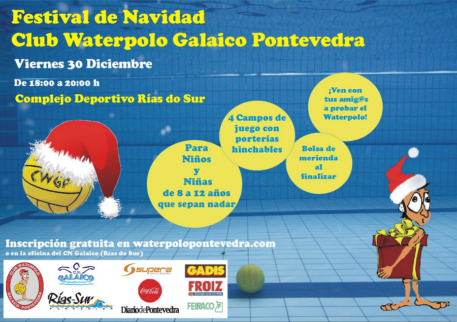 El próximo viernes 30 de diciembre el Club Waterpolo Galaico Pontevedra organiza en la piscina olímpica del Complejo Deportivo Rías do Sur su FESTIVAL DE NAVIDAD.