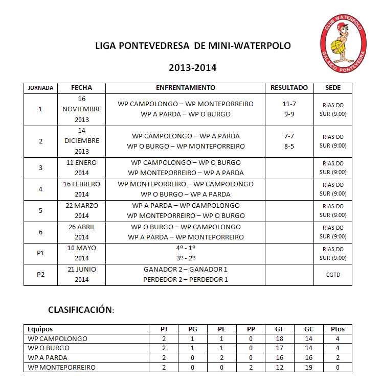 Tras esta segunda jornada hay un empate a 4 puntos en la clasificación entre WP Campolongo (líder por diferencia de goles) y WP O Burgo, seguidos de WP A Parda con dos puntos y Wp Monteporreiro con cero puntos. La próxima jornada será el 11 de enero.