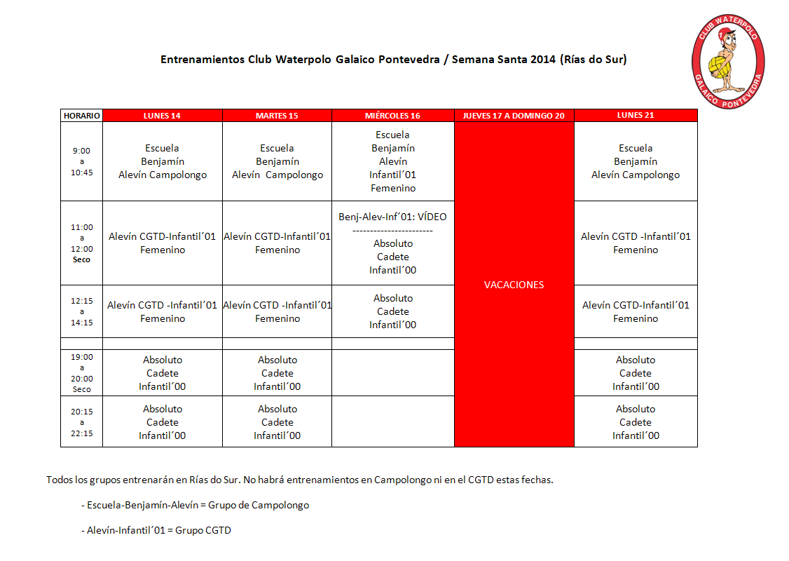 Del 14 al 21 de abril inclusive (días no lectivos) todos los grupos entrenarán en Rías do Sur.