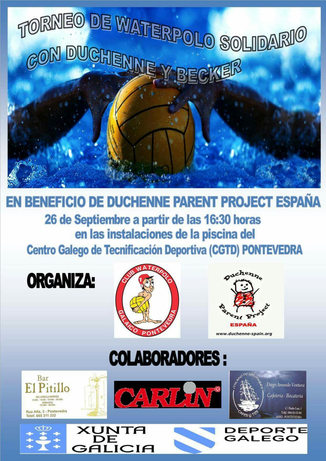 Desde el Club Waterpolo Galaico Pontevedra animamos a la gente a pasarse por la piscina del CGTD la tarde del sábado para colaborar con la Asociación Duchenne Parent Project.