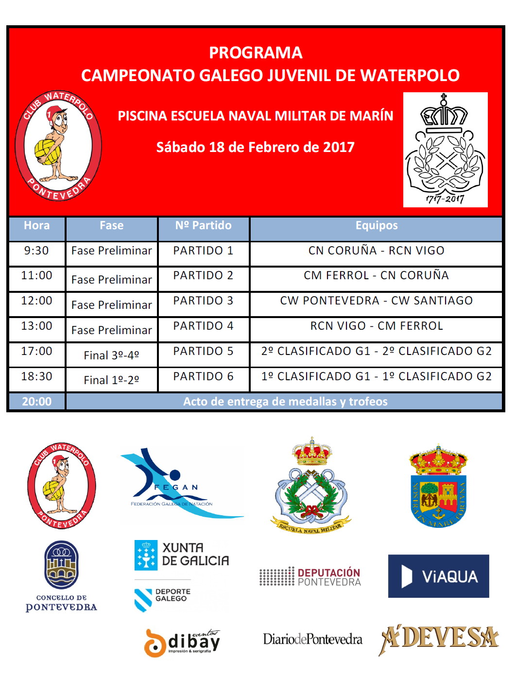 Por la mañana se disputa la fase previa, lo que serían las semifinales, pero con una semifinal entre dos equipos (CW Pontevedra – CW Santiago) a las 12:00 h y otra entre tres equipos, a modo de triangula, con partidos de menor duración: CN Coruña-RCN Vigo (9:30), Marina Ferrol-CN Coruña (11:00) y RCN Vigo-Marina Ferrol (13:00h). Por la tarde se jugarán las finales por el tercer y cuarto puesto (17:00) y por el título (18:30 h), con entrega de trofeos prevista para las 20:00 h.