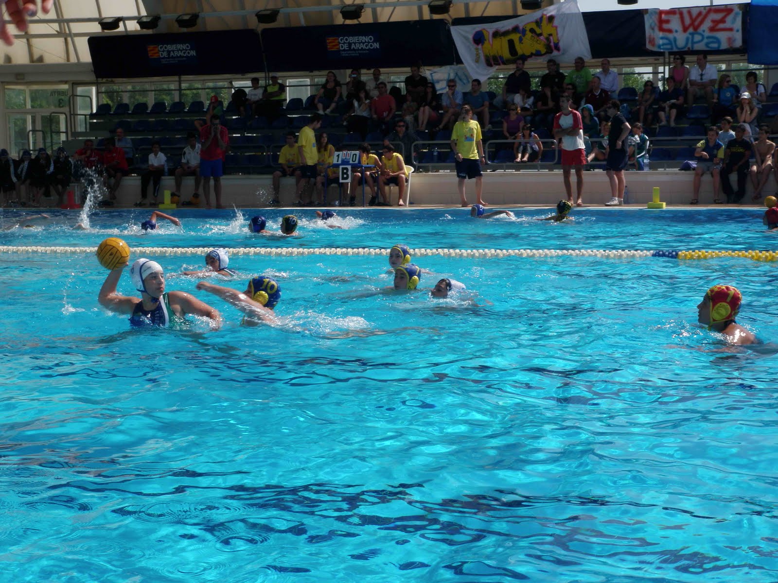 Aparte de este episodio, el equipo llego a la capital Aragonesa a las 6:30, de tal forma que hubo que madrugar, y después de una pequeña excursión hacia la piscina, llegó lo grande: 4 campos de mini-waterpolo con sus respectivas porterías adaptadas, 24 equipos dispuestos a darlo todo, más de 40 entrenadores disfrutando del deporte, y como no podía faltar la mejor afición, las mamás y papás de los jóvenes deportistas.