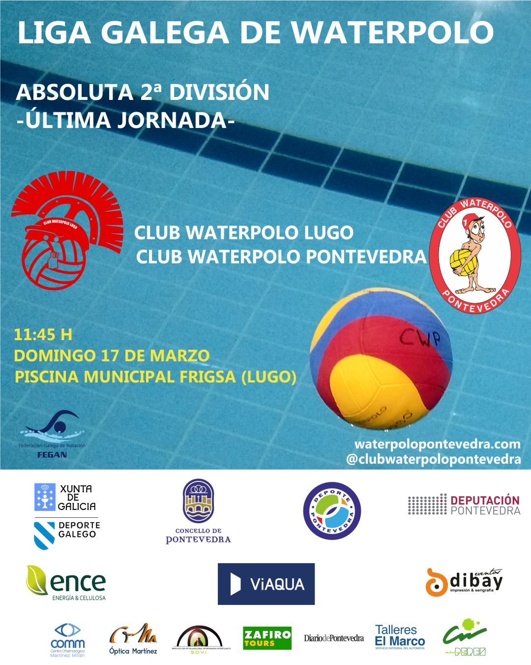 Será la última jornada de la Liga Gallega Absoluta de 2ª División, donde el CW Pontevedra, que está empatado a puntos con el RCN Vigo, podría hacerse con el título de liga en caso de victoria gracias al golaverage particular tanto con el RCN Vigo como con el CW Santiago (tercer clasificado).
