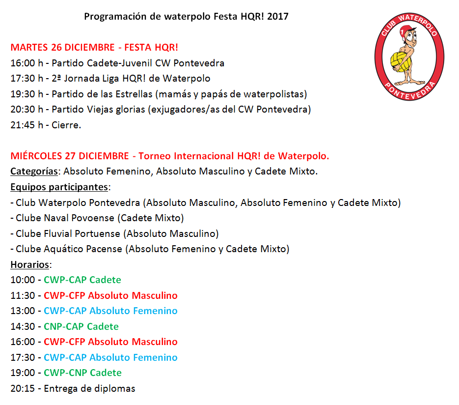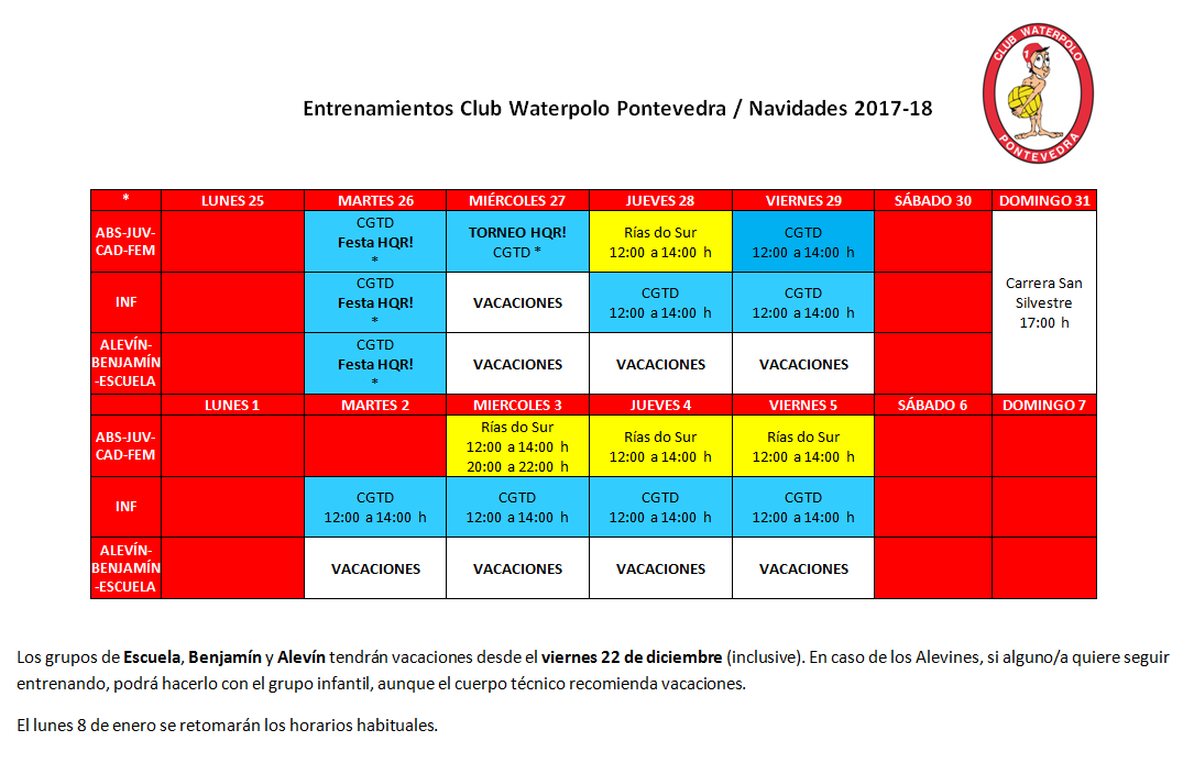 Aquí tenéis la programación de entrenamientos y actividades de waterpolo para el periodo de fiestas navideñas.
