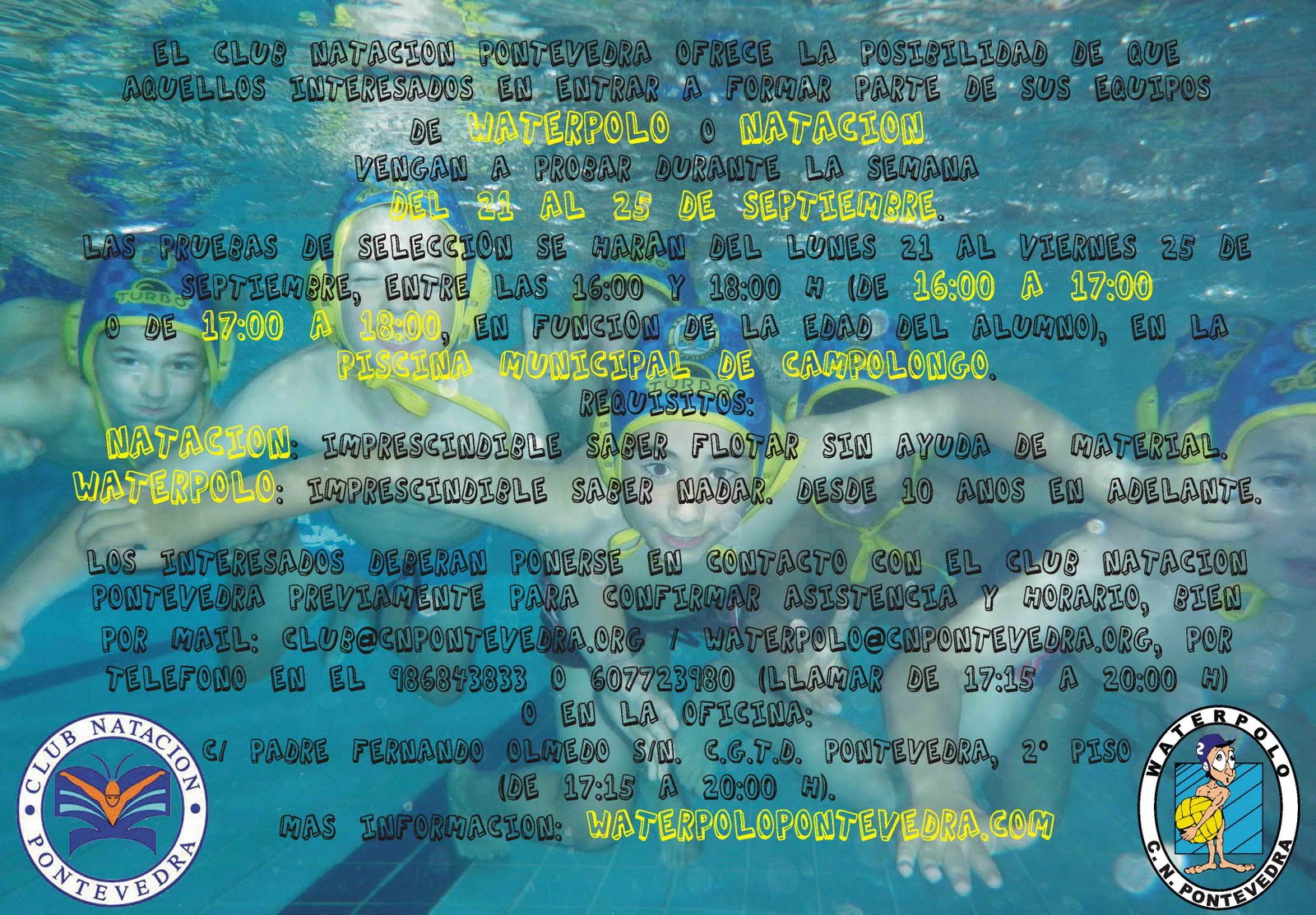 El Club Natación Pontevedra ofrece la posibilidad de que aquellos interesados en entrar a formar parte de sus equipos de waterpolo o natación vengan a probar durante la semana del 21 al 25 de septiembre.