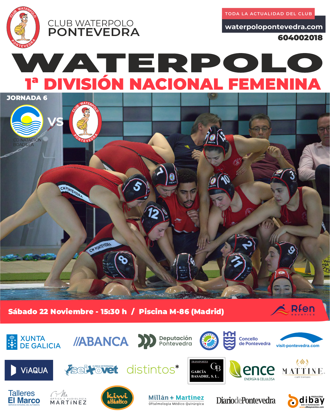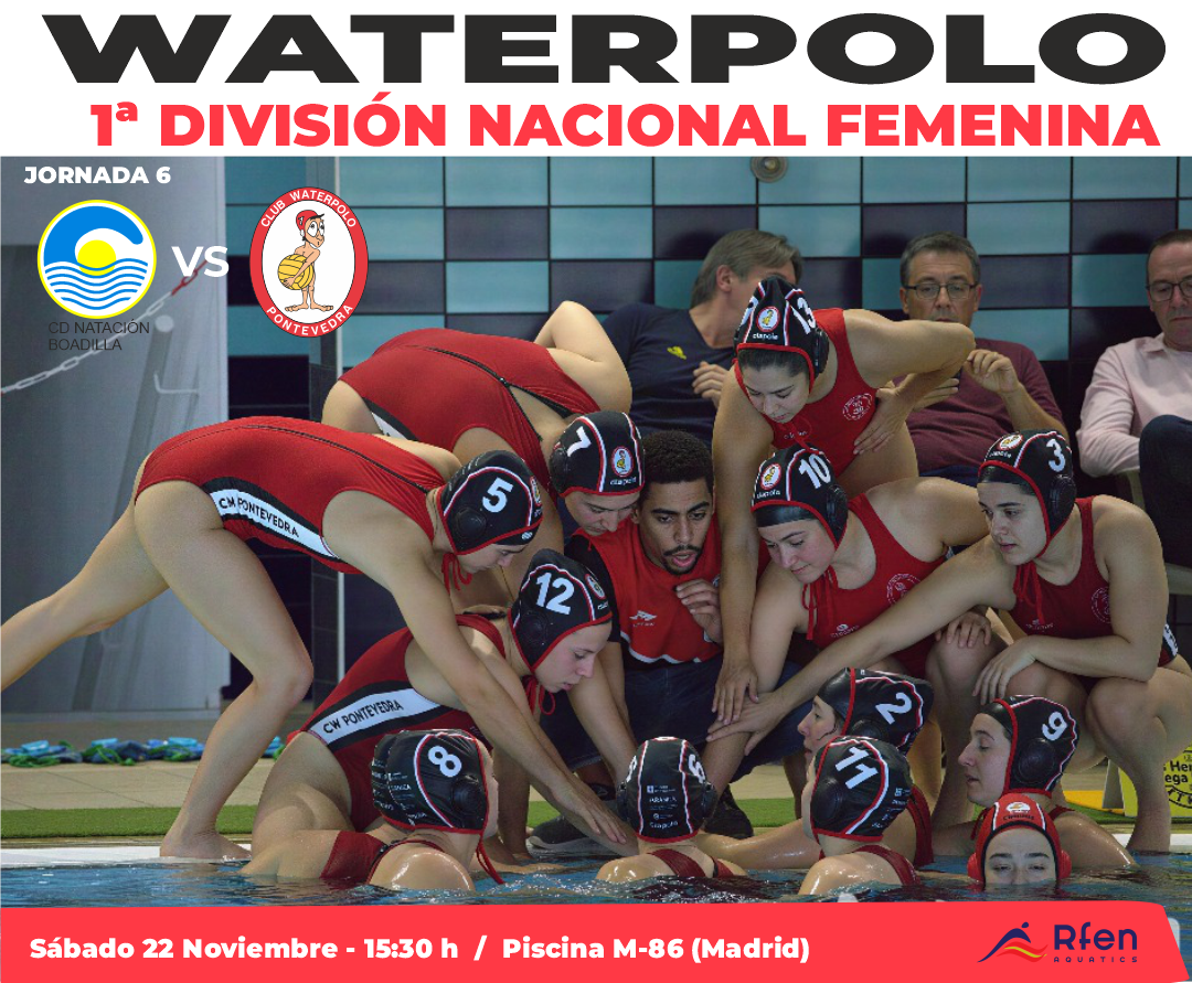 El CW Pontevedra viaja a Madrid (Piscina M 86) en busca de su sexta victoria consecutiva en la Liga Nacional de Primera División Femenina de waterpolo. El rival será en CD Natación Boadilla, que no se lo pondrá fácil al equipo pontevedrés.