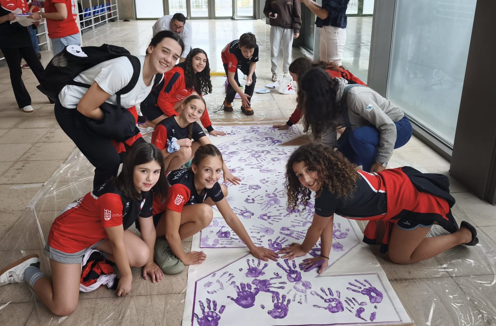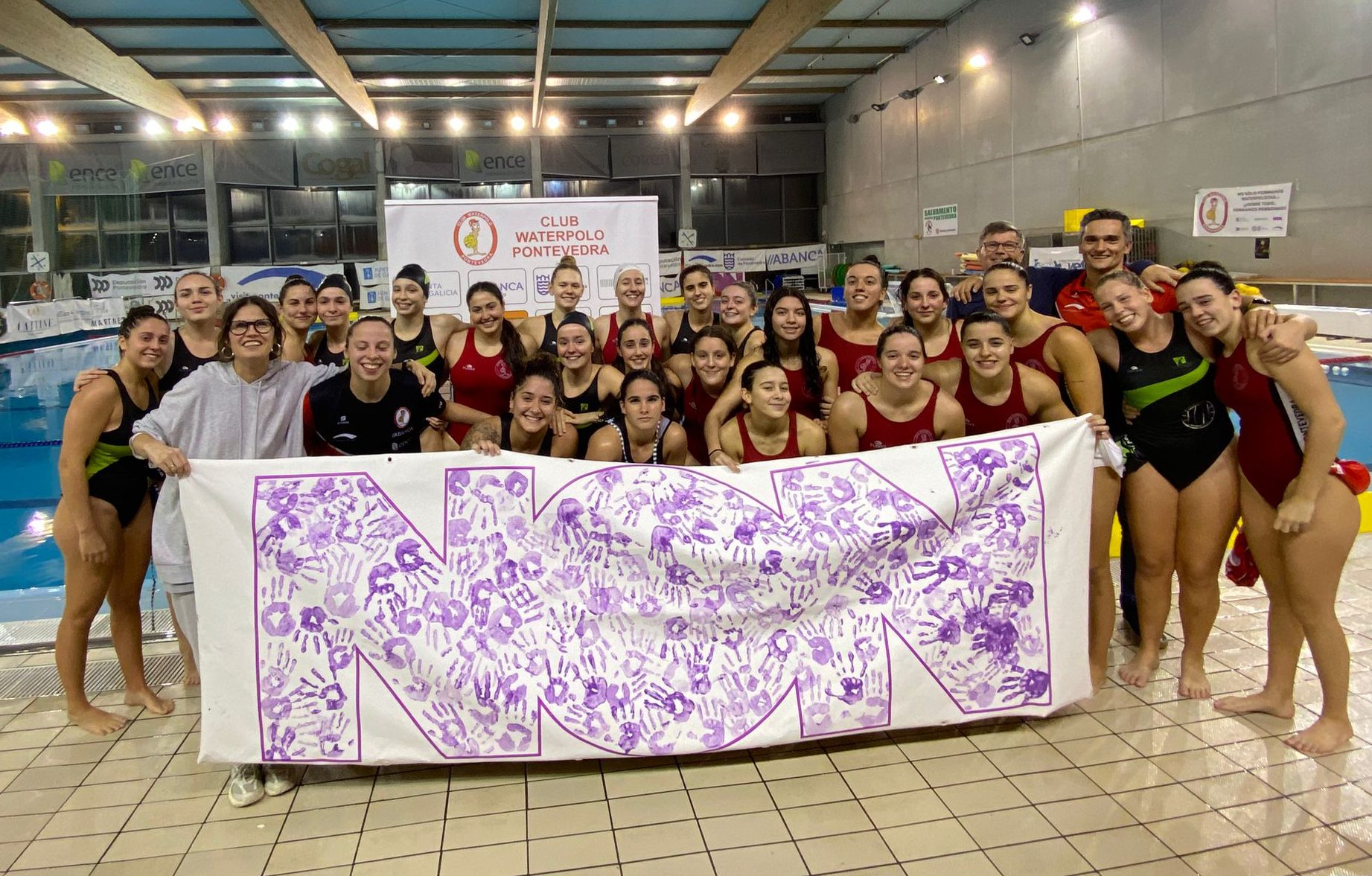 Tras el encuentro, las jugadoras de ambos equipos posaron con una pancarta de NON con la que conmemorar la Promoción y sensibilización del deporte femenino de la Secretaría Xeral para o Deporte, con motivo del Día Internacional de la Eliminación de la Violencia contra la Mujer del próximo 25 de noviembre. La pancarta fue elaborada por deportistas del CW Pontevedra a lo largo del día, poniendo sus manos con pintura morada. A la foto se unieron Anabel Gulías, concelleira de Deportes del Concello de Pontevedra, y Serafín Piñeiro, Presidente de la Fundación Rías do Sur.
